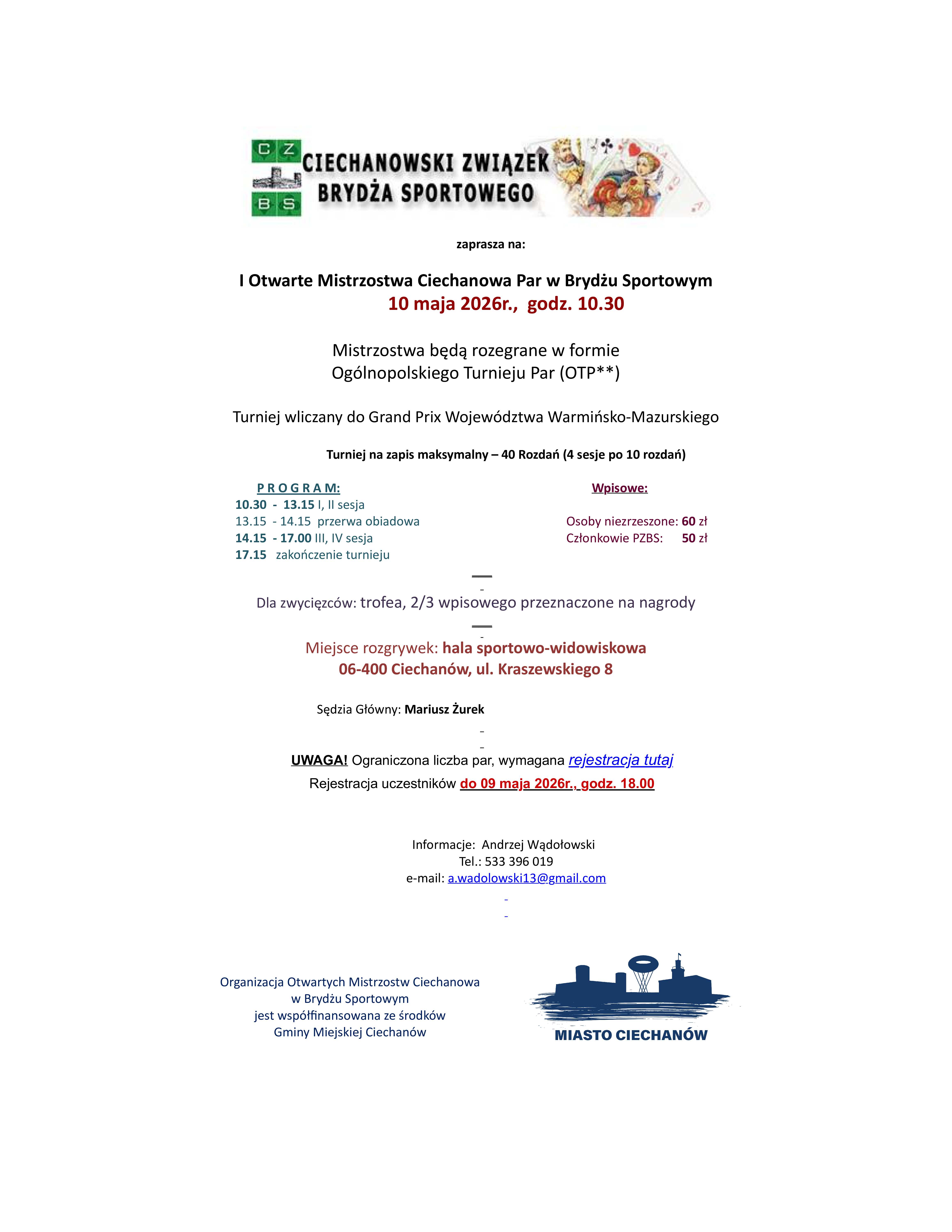 Na zdjęciu: Roman Kierznowski, Hubert Konatowski, Patryk Albin, Janusz Budny, Hubert Karwicki, Lech Grabski, Stanisław Baraszkiewicz, Grażyna Blech – członkini zarządu, Zygmunt Kuczyński, Amelia Grzmil oraz Mirosław Cichocki – wiceprezes. W Mistrzostwach Województwa Seniorów czołowe miejsca zajęły pary: W konkurencji juniorów zwyciężyła para Patryk Albin–Hubert Karwicki, przed najsympatyczniejszym mikstem Mistrzostw – Amelią Grzmil–Hubertem Konatowskim, którym serdecznie dziękujemy za udział w turnieju i życzymy sukcesów.